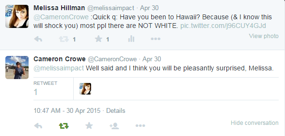 I think the thing that’s the most depressing about this is that Cameron Crowe evidently felt so confident about this hapa character that he would personally tell me that my concerns about race in his film were unfounded, and that I would be “pleasantly surprised.” He seems to actually believe that casting Emma Stone as hapa Allison Ng quells concerns about the lack of diversity in his film, rather than creates more concerns.