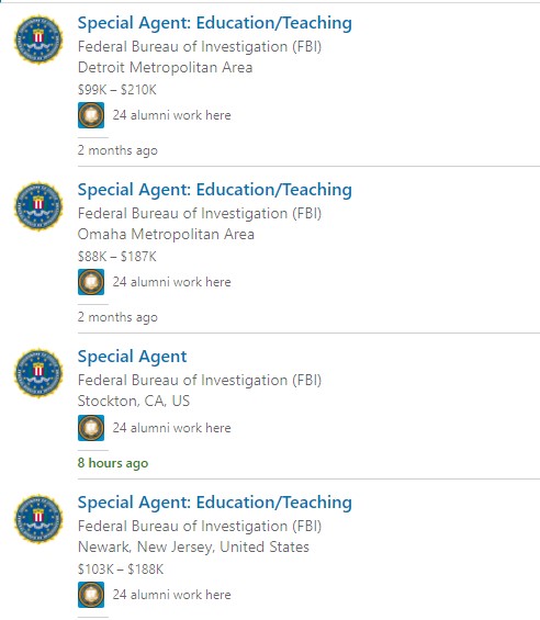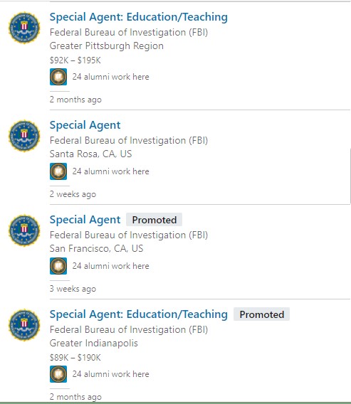 Here are a few screenshots from LinkedIn that show some of the breadth of the FBI recruitment of teachers: